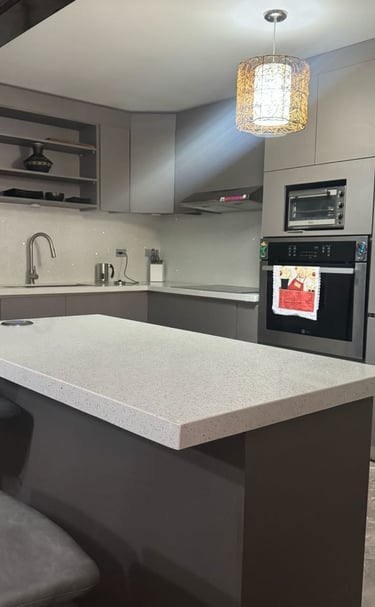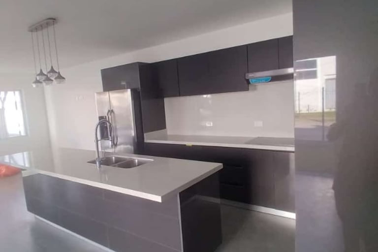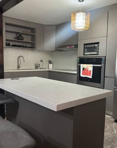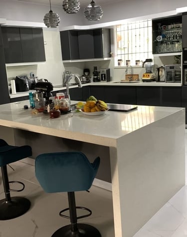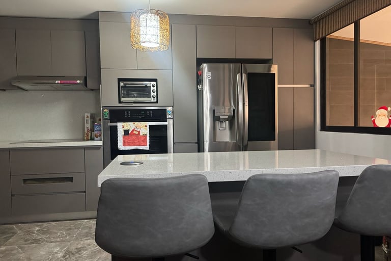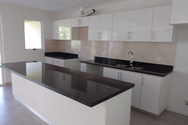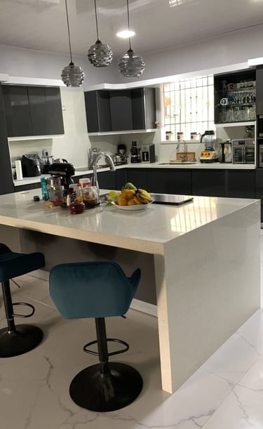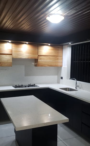 Muebles con sobres de cuarzo y porcelánico.